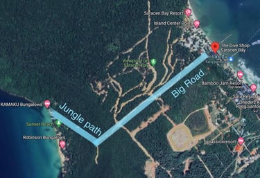 You will stop on Eden pier, Saracen bay. From there go to the Dive shop and behind you will find a path to Sunset Beach. It’s a jungle walk that takes around 30-40 minutes.